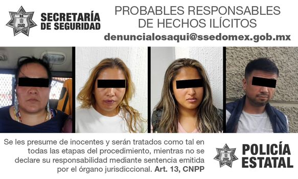 Metepec, México. En atención oportuna a una consiga operativa emitida por el Centro de Control, Comando, Comunicación, Cómputo y Calidad (C5) de la Secretaría de Seguridad (SS) uniformados estatales detuvieron en flagrancia a un hombre y a tres mujeres por su posible participación en el delito de robo a negocio.