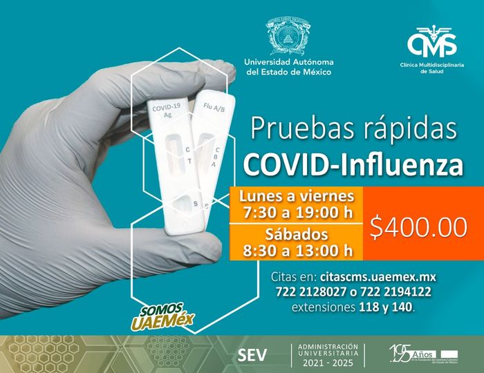 Ante el incremento de enfermedades respiratorias, la Clínica Multidisciplinaria de Salud (CMS) de la Universidad Autónoma del Estado de México (UAEMéx) ofrece a la comunidad universitaria y público en general pruebas rápidas COVID 19-influenza, por un costo de 400 pesos.