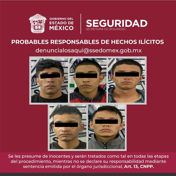 Luego de leer los derechos que confiere la ley, detuvieron a Rodrigo “N” de 25 años, Ricardo “N” y Miguel “N” ambos de 23 años, Jesús “N” de 29 y Brayan “N” de 24 años, quienes junto con los indicios fueron presentados ante la Agencia del Ministerio Publico con sede en Cuautitlán Izcalli, donde se determinará su situación jurídica.