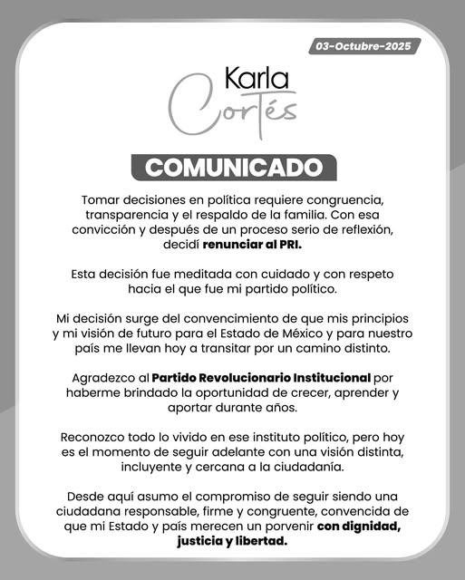 A través de un comunicado Karla Cortés hizo pública su renuncia a la militancia al asegurar que sus principios y visión de futuro la llevan a transitar por un camino distinto. Esto es, no está de acuerdo en la forma de cómo se conducen los destinos de su ex instituto político.