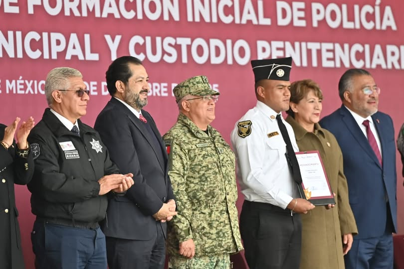 El diputado José Francisco Vázquez Rodríguez, presidente de la Junta de Coordinación Política de la LXII Legislatura mexiquense, acompañó a la gobernadora Delfina Gómez Álvarez a la ceremonia institucional de graduación de 148 personas de los cursos de Formación Inicial para Policía de Proximidad Estatal, Municipal y Custodio Penitenciario, impartidos por la Universidad Mexiquense de Seguridad.