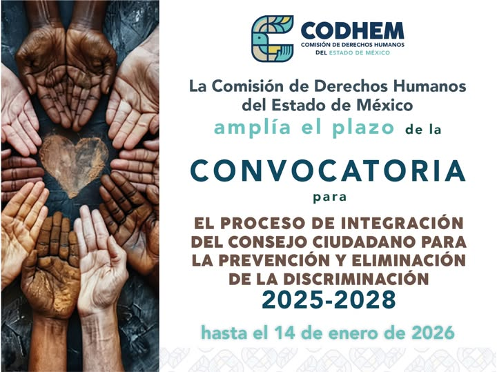 La Comisión de Derechos Humanos del Estado de México (CODHEM) hace un llamado a inscribirse, a más tardar el 14 de enero, al proceso de integración del Consejo Ciudadano para la Prevención y Eliminación de la Discriminación 2025-2028.