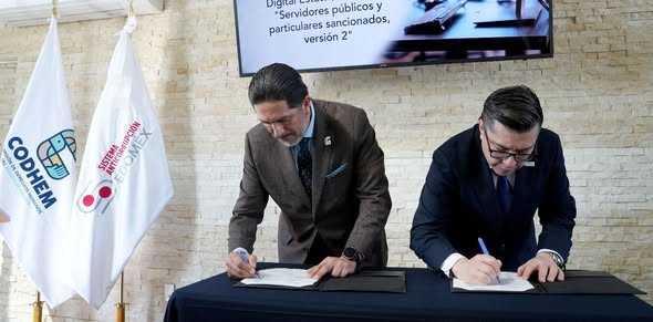 La Comisión de Derechos Humanos del Estado de México (CODHEM) y la Secretaría Ejecutiva del Sistema Anticorrupción del Estado de México (SESAEMM) firmaron un convenio de colaboración con el objetivo de impulsar acciones conjuntas orientadas a promover la integridad pública, la cultura de la legalidad y la prevención de conductas que afecten el ejercicio responsable del servicio público.