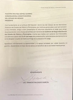 El director general del Instituto de Seguridad Social del Estado de México y Municipios (ISSEMyM), Ignacio Salgado García, presentó su renuncia al cargo, la cual surtirá efecto a partir del 1 de mayo de 2026.